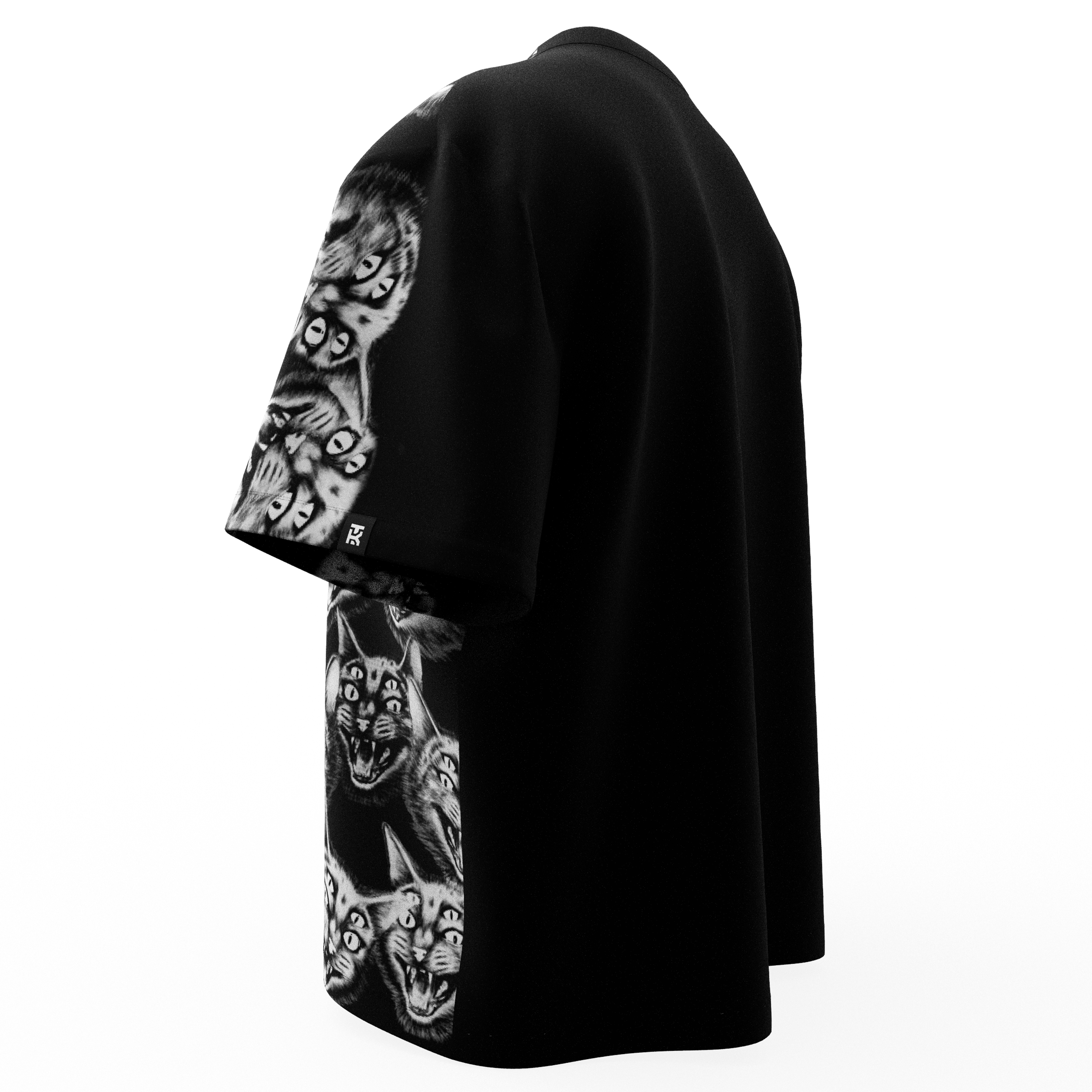 Unleash the chaos. This tee is loaded with hypnotic cat faces for a bold and fearless streetwear vibe.