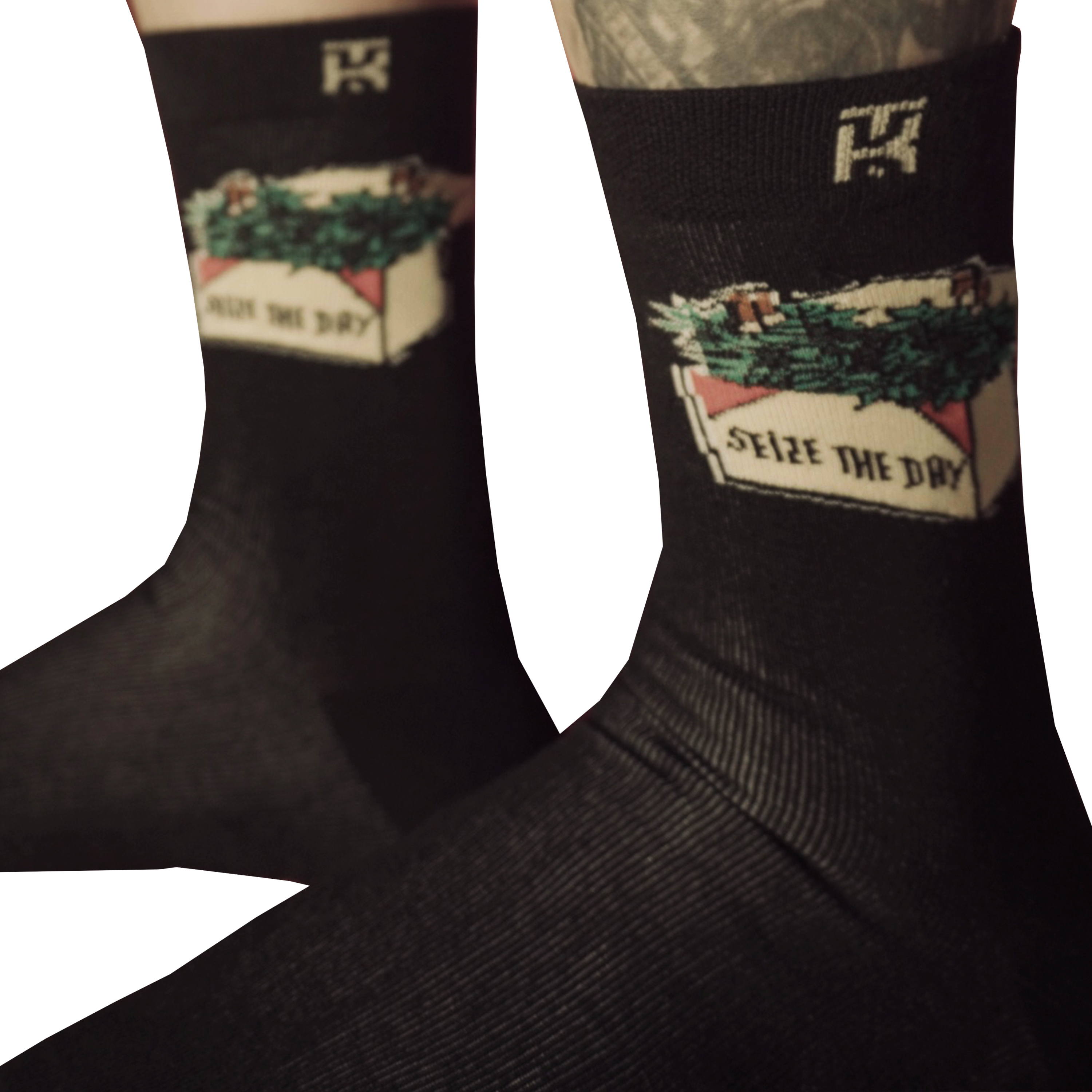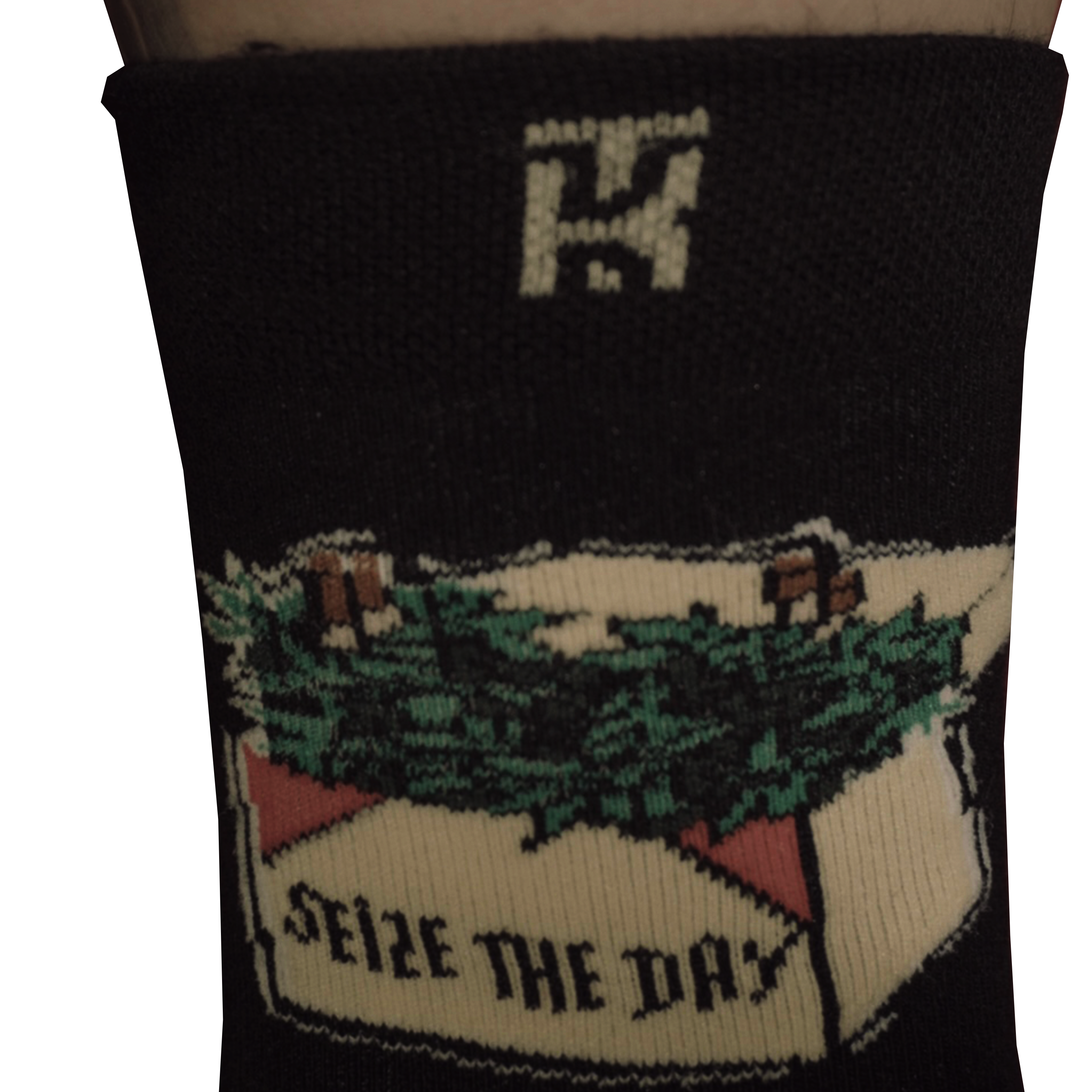 The Seize The Day Socks feature a fun, vintage-style design with leafy greens popping out of a bold “Seize The Day” box. Perfect for lazy mornings, chill hangs, or when you’re trying to romanticize your 9AM grind.